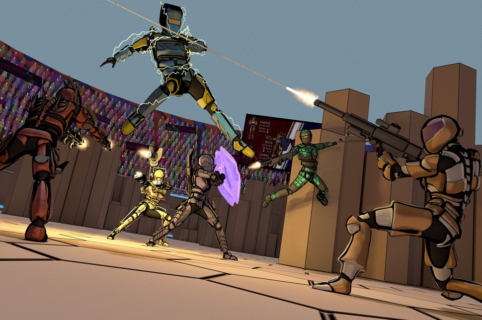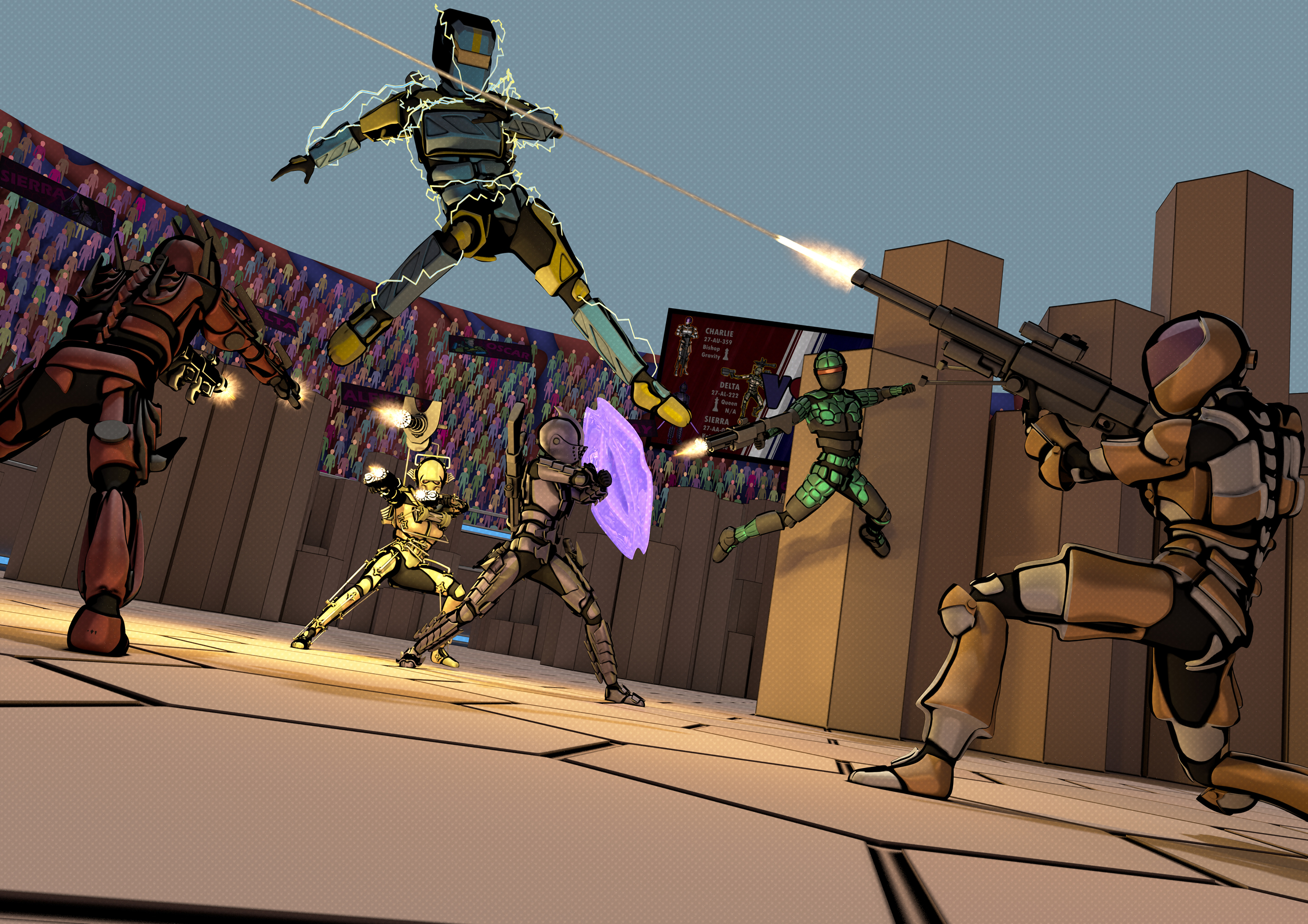 As part of my final year of university, I had to work on a project for six months. My project was called "Gauntlet", a 4-minute-long, stylised, 3D animation. It's sci-fi-action and the story is about these six characters who take part in a sporting event that uses sci-fi armour and superpower-like abilities. I created this animation using a mixture of motion capture and hand animation in Autodesk Maya, as well as some additional effects added in Adobe After Effects. The animation can be found below. More details about the project can be found in the sections after this.