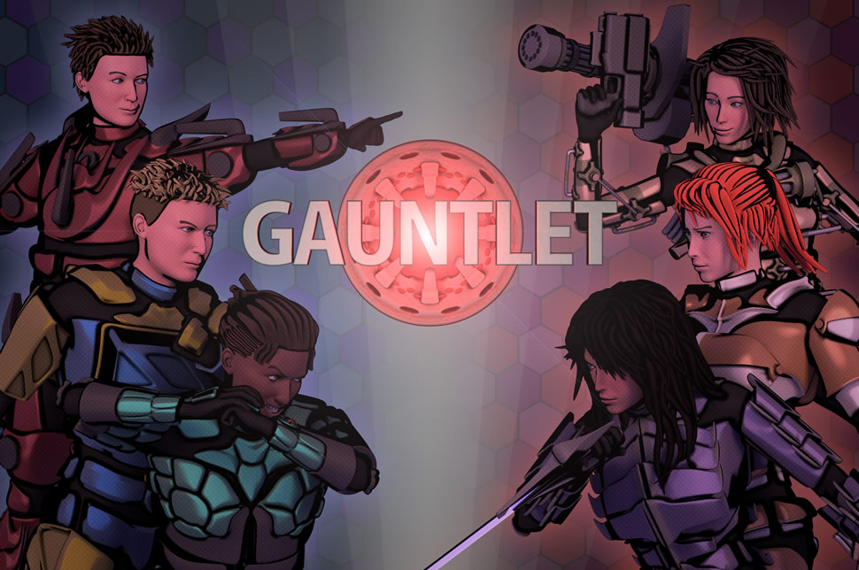 It’s called “Gauntlet” because the main characters wear sci-fi armour that, when in its “standby” mode, is compacted into a single forearm piece (a gauntlet) but when activated, covers their entire body in the armour. Each character has a unique ability/super power called a “Talent”.